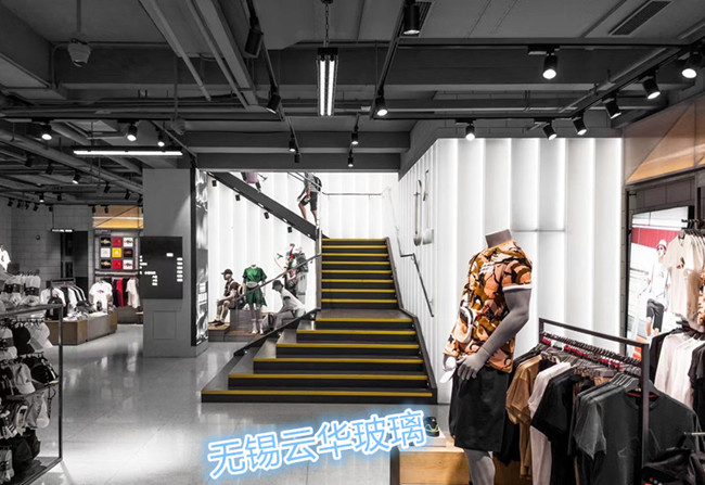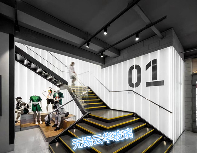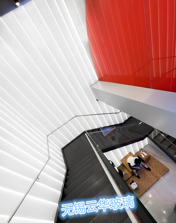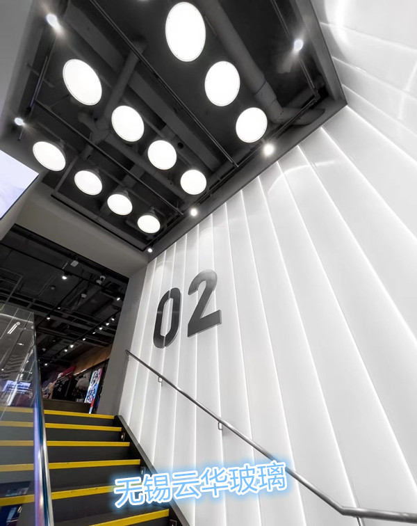 選用無(wú)錫云華超白細(xì)條紋噴砂U型玻璃,多種異形裁切。