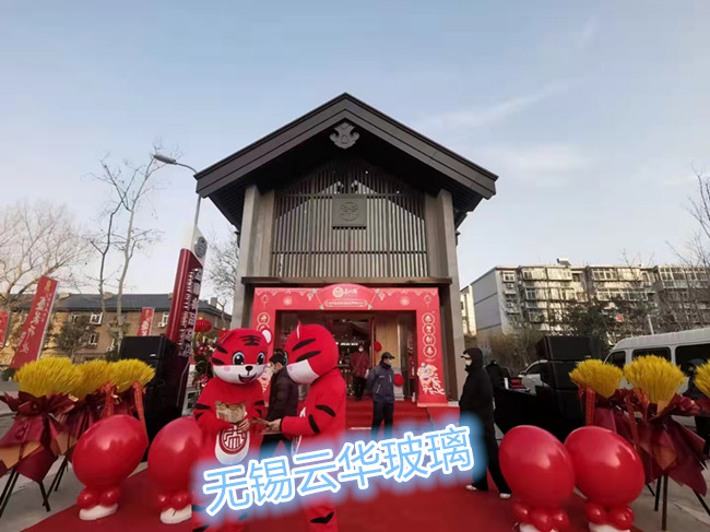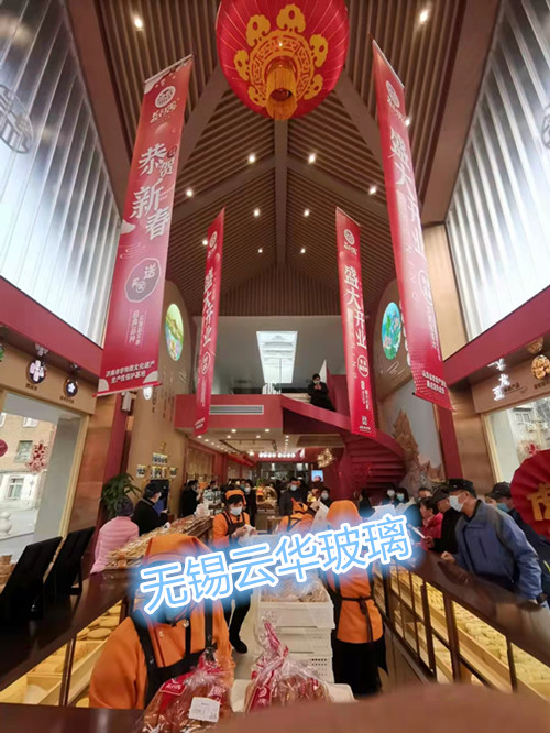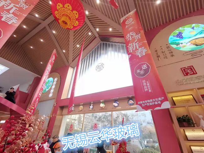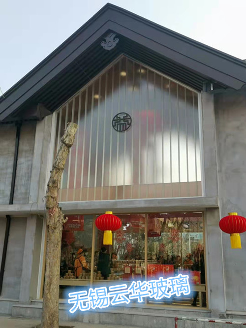 選用無錫云華K25*60*7超白香梨紋。此項目從設(shè)計至安裝都由無錫云華玻璃有限公司完成。其中有多塊近6米異形裁切U型玻璃。