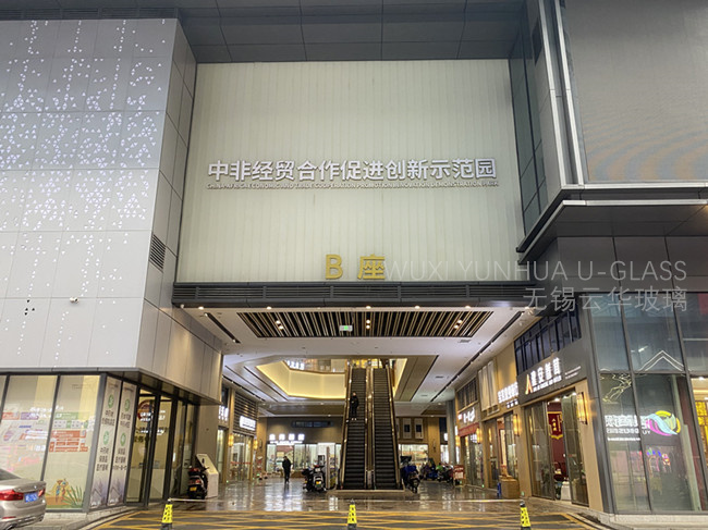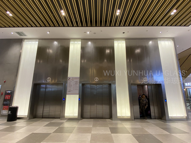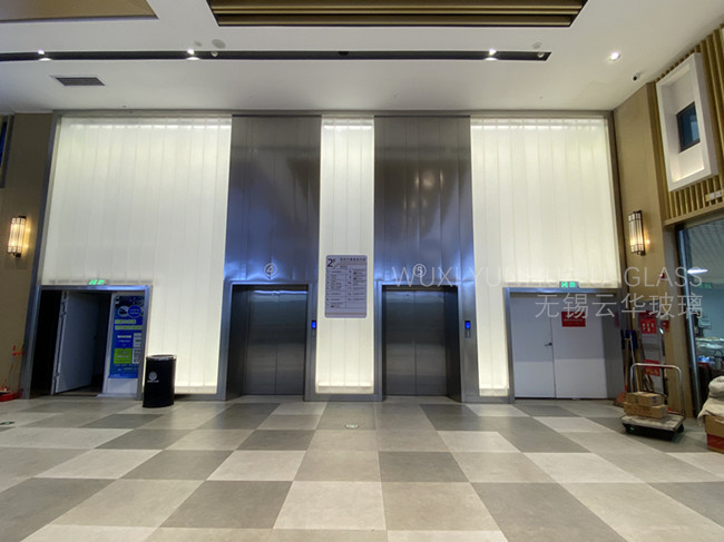 選用無錫云華K25*90*8超白香梨紋噴砂U型玻璃